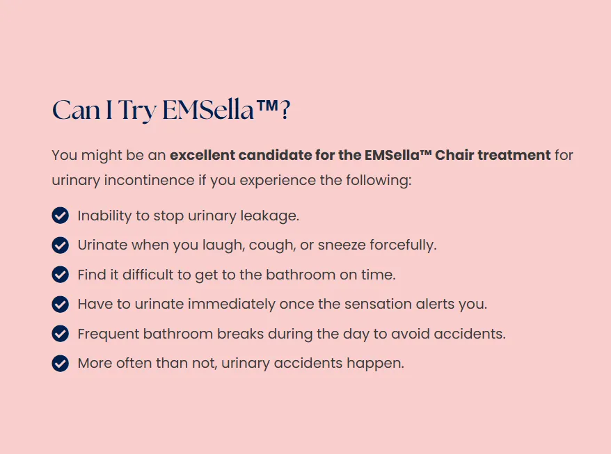 The EMSella™ Chair, a non-invasive treatment utilizing electromagnetic energy, is designed to address a variety of urinary incontinence concerns, including bladder control, leakage, uterine prolapse, and difficulty holding urine.